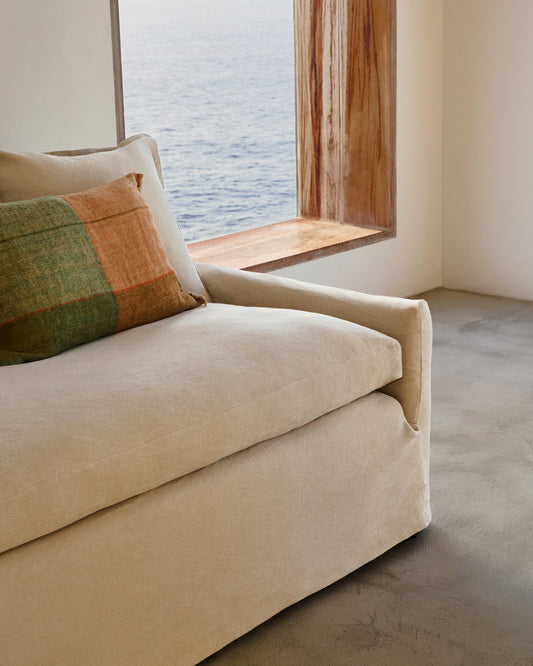 Zenira sofa sa skidivim pokrivačem i bež pamučnim i lanenim jastucima, 230 cm