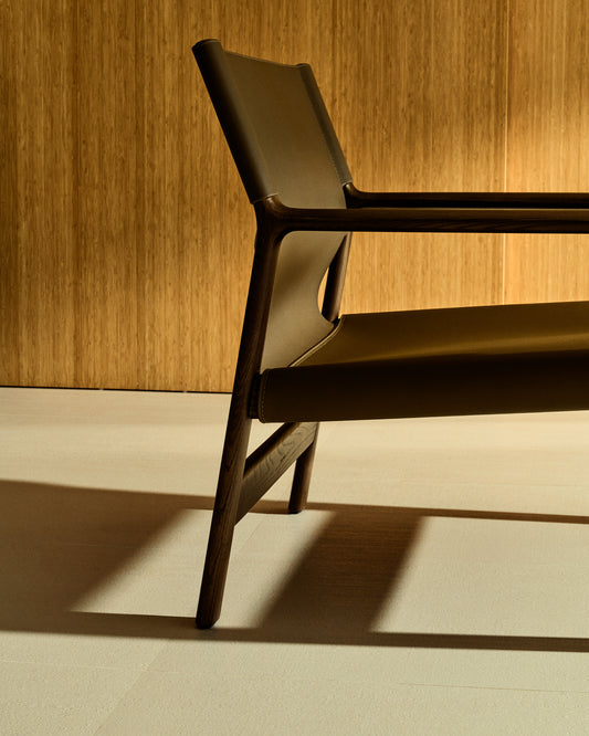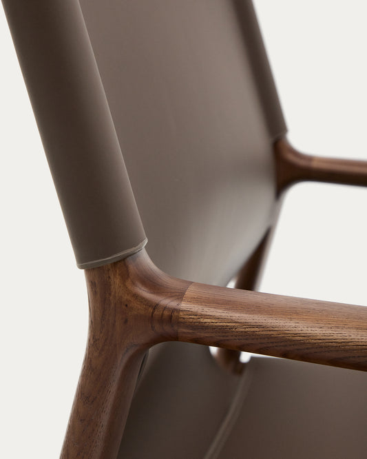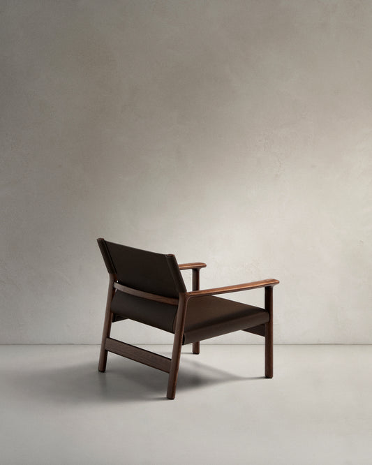 Jan armchair in dark brown recycled leather fiber and FSC 100% solid ash wood with walnut finish