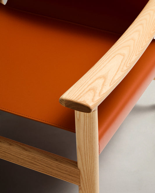 Jan armchair in light brown recycled leather fibers and FSC 100% solid ash wood with a natural tone finish