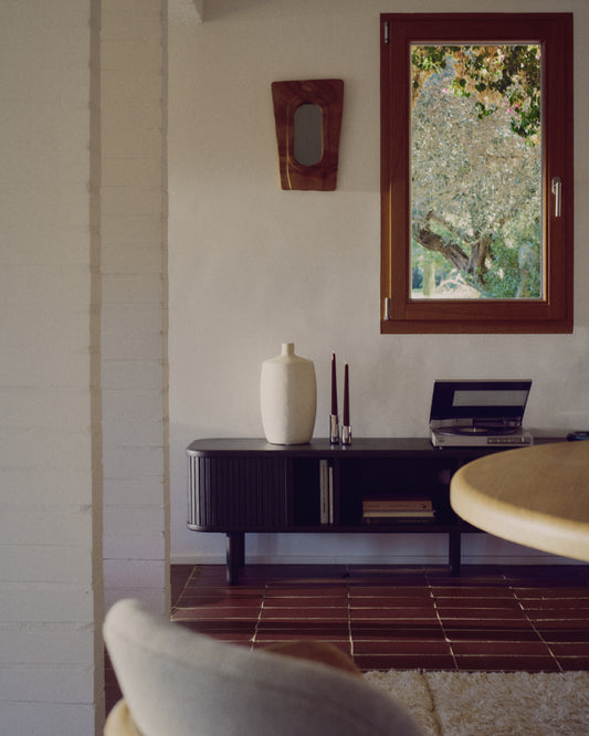 - 2 sliding doors made of wooden slats to hide or show the interior of the sideboard.