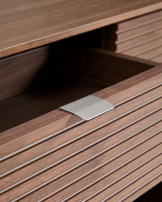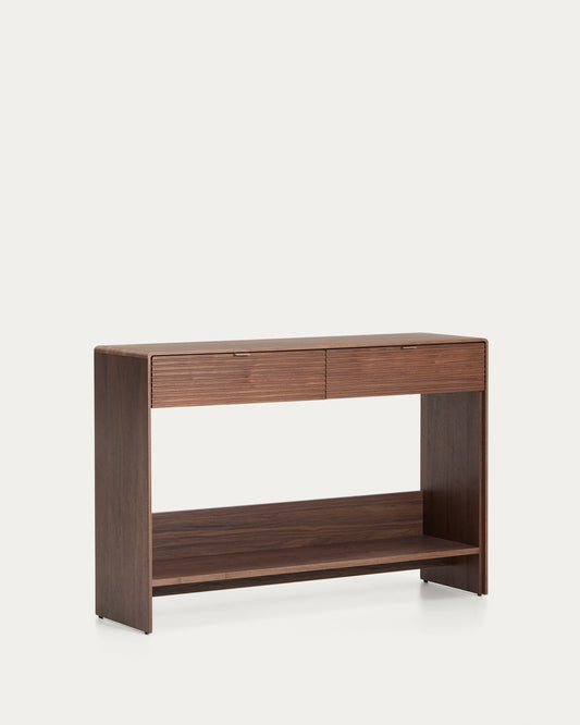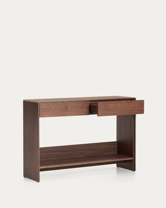 - Walnut veneer cabinet with 2 drawers and a shelf at the bottom.