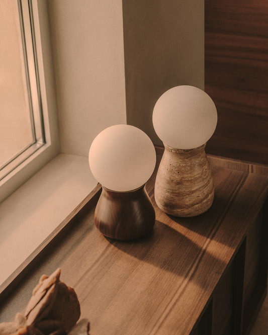 Okeni table lamp made of travertine and glass