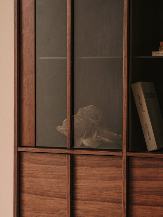 - Upper part with doors and shelves in tempered glass and lower part with doors and shelves in walnut veneer.