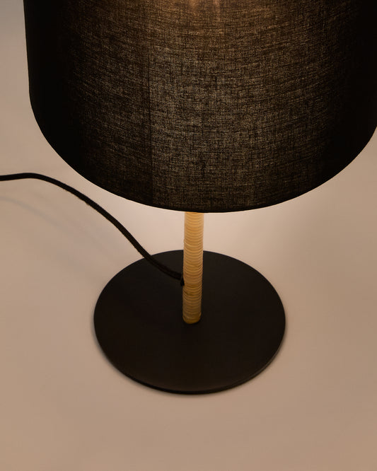 - Metal table lamp with natural rattan details and black cotton lampshade.