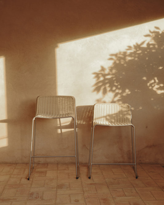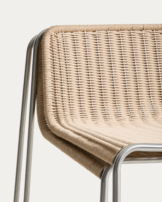 Stackable Tavari bar stool made of beige synthetic rope and AISI 304 stainless steel with brushed effect, height 75 cm