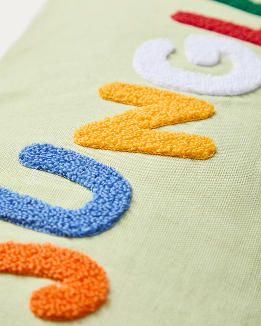 Tandani green cotton cushion cover with multicolored embroidered letters, 30 x 50 cm