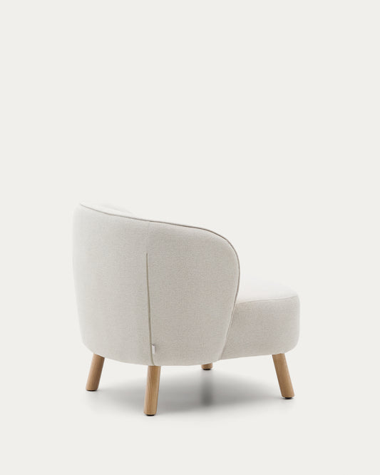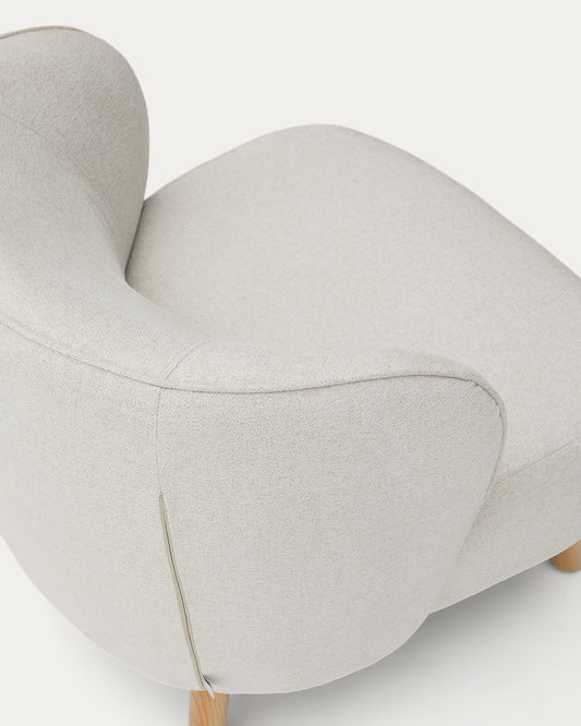 Molded armchair in beige chenille with solid beech legs in a natural finish
