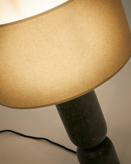 - Green marble table lamp with gray fabric shade.