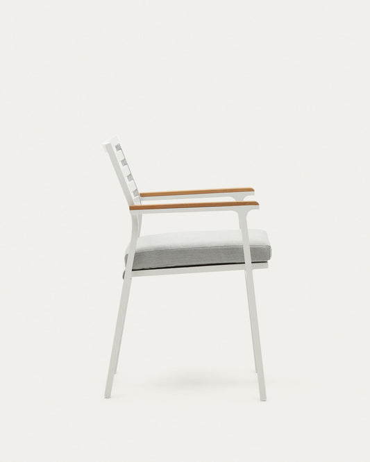 Aluminijumska baštenska stolica Bona koja se može složiti sa belom završnom obradom i naslonima za ruke od punog tikovinog drveta