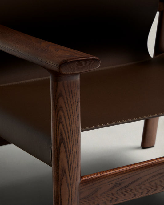 Jan fotelja od tamno braon recikliranih kožnih vlakana i FSC 100% punog jasenovog drveta sa završnom obradom u boji oraha