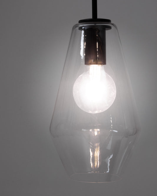 - Plafonska lampa od stakla sa prozirnom završnom obradom i crnim nosačem.