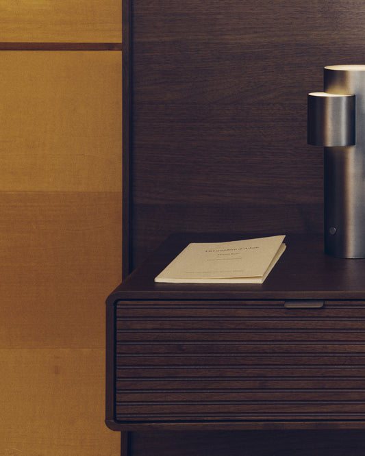 - Krevet sa tablom i dva noćna ormarića od furnira od oraha sa horizontalnim linijskim frezovanjem i LED trakom na vrhu.