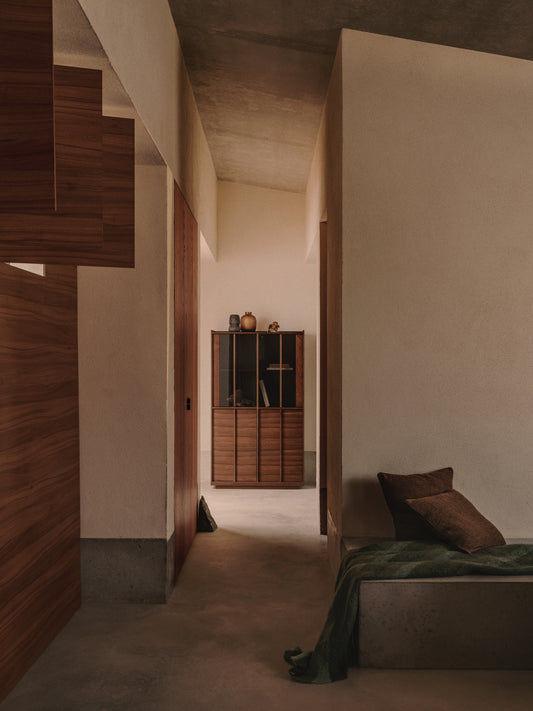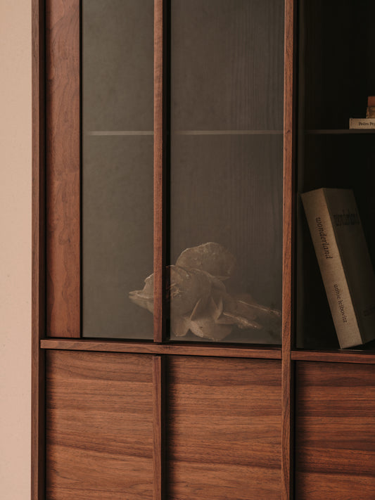 - Vitrina od punog oraha sa orahovim furnirom u tamnoj završnoj obradi i dimljenim kaljenim staklom.