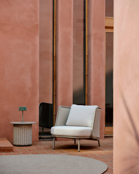 - Stol za kafu napravljen od aluminijuma i ručno tkanog postolja od užadi otpornog na UV zračenje, ojačanog čeličnom postoljem za stabilizaciju komada.