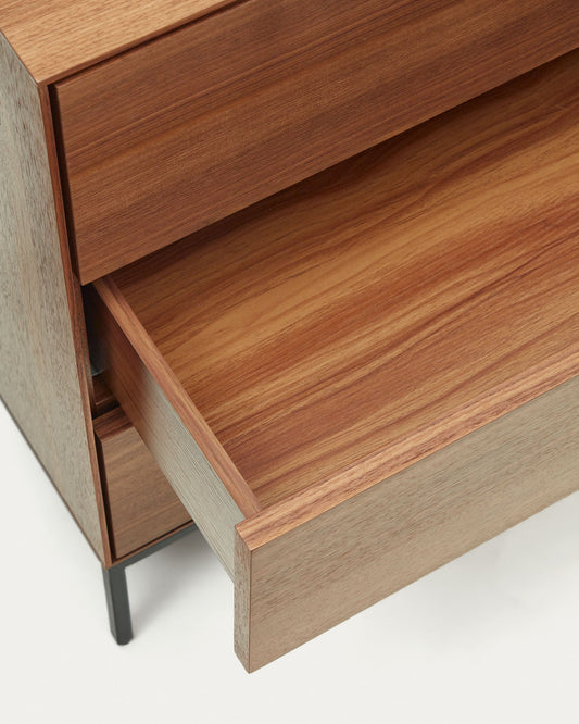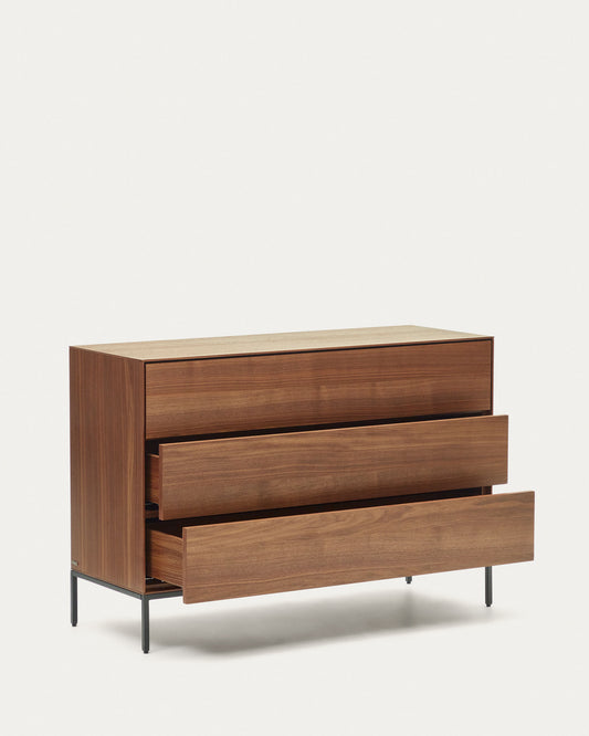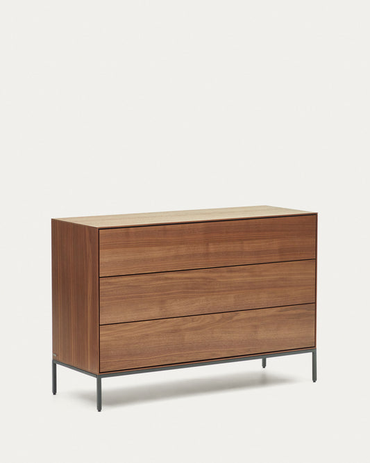 Vedrana komoda sa 3 fioke u furniru oraha sa crnim čeličnim nogama, 110 x 75 cm